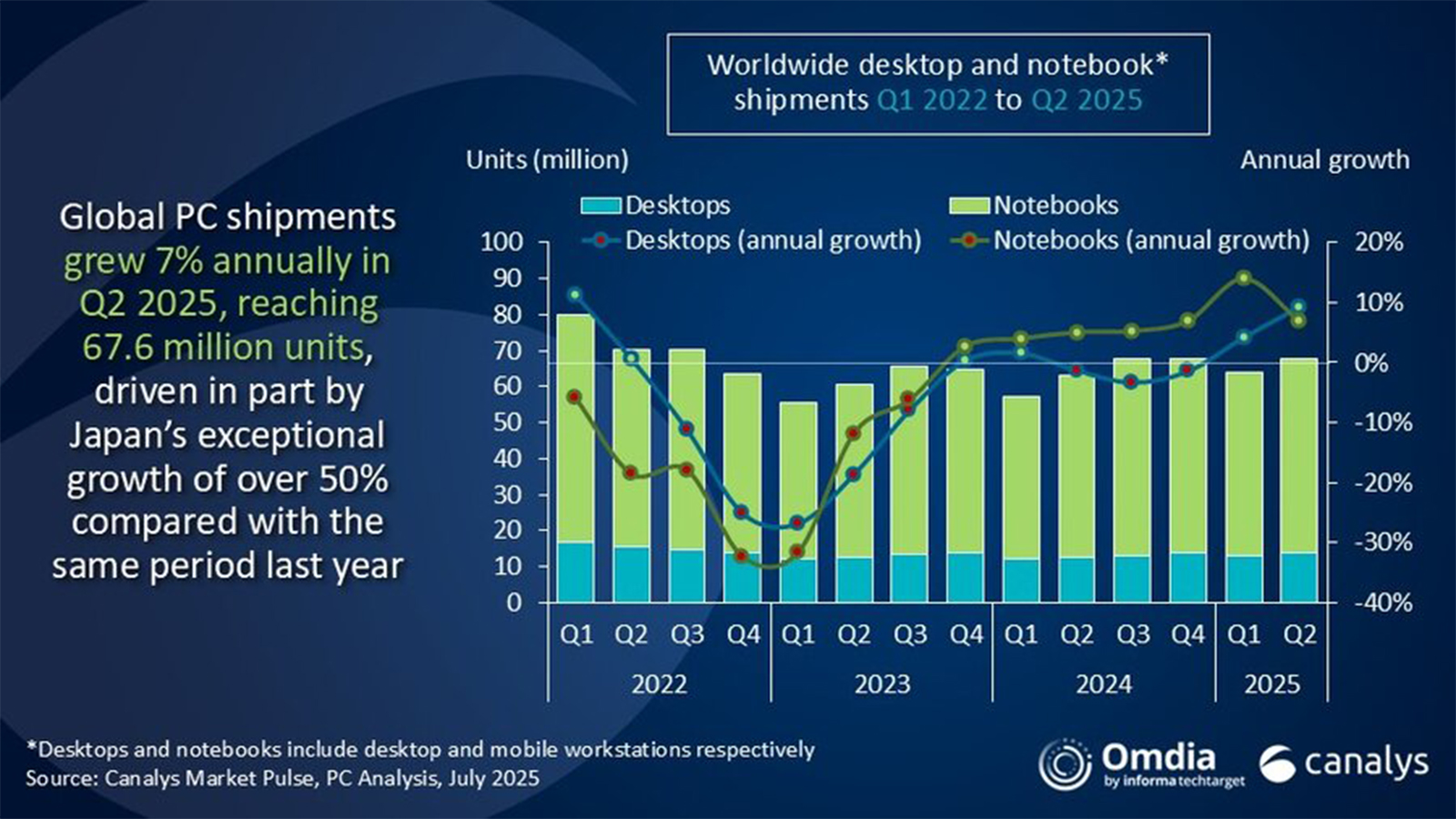Según los últimos datos de Canalys, los envíos totales de computadoras de escritorio, portátiles y estaciones de trabajo crecieron un 7,4% a 67,6 millones de unidades en el segundo trimestre de 2025.