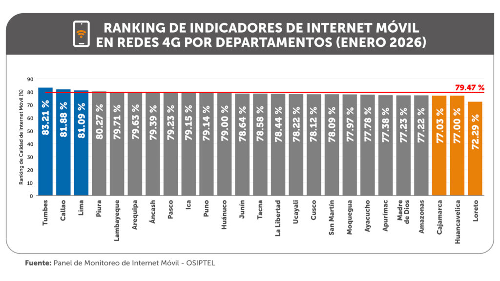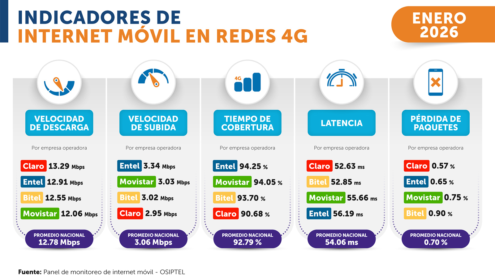 En enero, el promedio ponderado a nivel nacional de todos los indicadores de internet móvil para redes 4G (velocidad de subida y bajada, latencia, pérdida de paquetes y tiempo de cobertura) fue de 79.47%, lo que significó una mejora respecto a al promedio de enero de 2025 (77.09%), informó Osiptel.