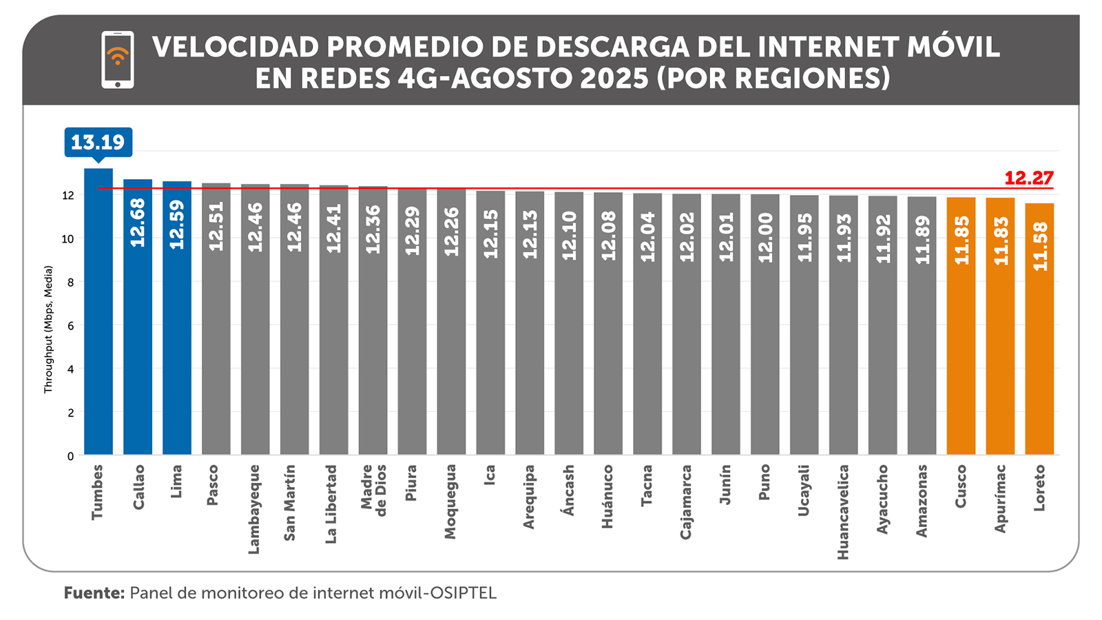 De acuerdo con la información publicada en Checa tu internet móvil (https://checatuinternetmovil.osiptel.gob.pe), en este periodo, Tumbes (13.19 Mbps), Callao (12.68 Mbps) y Lima (12.59 Mbps) fueron las regiones con los mejores promedios de velocidad de descarga a nivel nacional. En tanto, Cusco (11.85 Mbps), Apurímac (11.83 Mbps) y Loreto (11.58 Mbps) tuvieron los desempeños más bajos a nivel nacional.