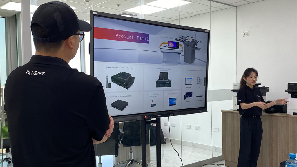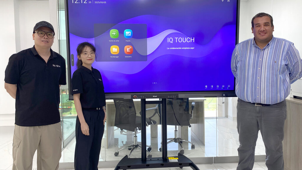 Durante su estadía, los especialistas presentaron al equipo local la evolución más reciente del portafolio IQTouch, destacando las capacidades técnicas de modelos como el QA1300 PRO y el TE1200 PRO, reconocidos por su resolución 4K, tecnología de baja luz azul, alta precisión táctil, con pantallas de hasta 110” y herramientas colaborativas integradas.