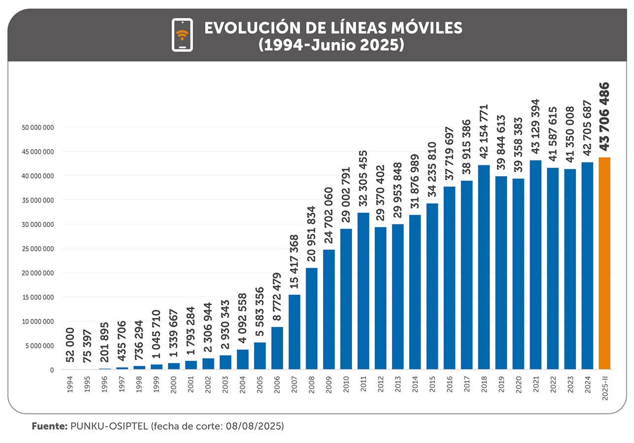 La competencia de las empresas operadoras y crecimiento de la demanda, dentro de un marco regulatorio inteligente, han permitido que el mercado móvil en Perú continúe expandiéndose y, al cierre del primer semestre de 2025, alcanzó la cifra histórica de 43.7 millones de líneas móviles activas, lo que representó un incremento de alrededor de un millón de líneas respecto al total registrado en diciembre de 2024 (42.7 millones), informó Osiptel.