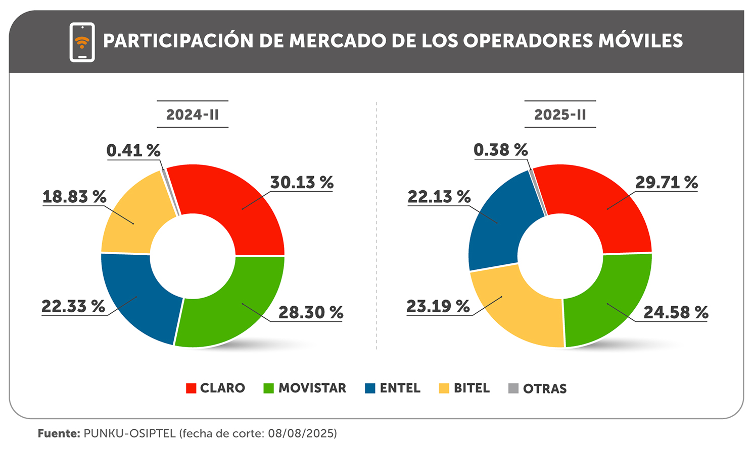 Al cierre del segundo trimestre de 2025, Claro reportó 12.99 millones de líneas móviles, lo que representó el 29.71 % de participación de mercado, que lo mantiene en el primer lugar de participación en el mercado, mientras que Movistar obtuvo el 24.58 % con 10.74 millones de líneas móviles.